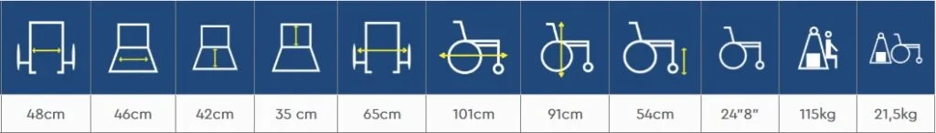 Výklopné ruční opěrky a odklopné nožní opěrky usnadňují nastupování a vystupování z vozíku. Pohon vozíku zajišťují dvě přední kola o rozměru 200 x 50 mm a 24" zadní pneumatická kola.