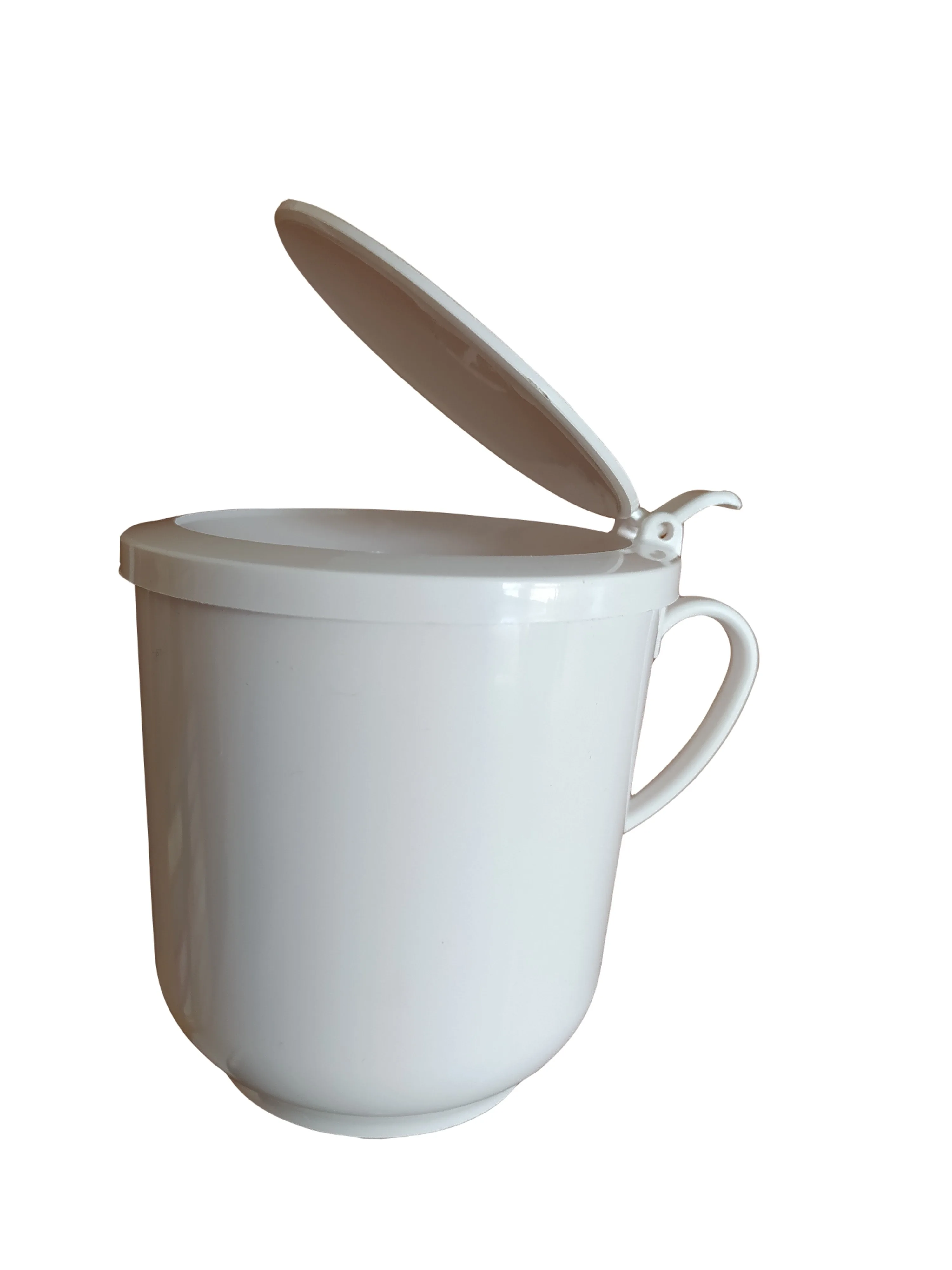 Pohár je dostupný v bílém provedení, s odnímatelným sklopným krytem. Je vyroben z kvalitního PP materiálu, odolný vůči nárazům a horké vodě. Obsah 300 ml.