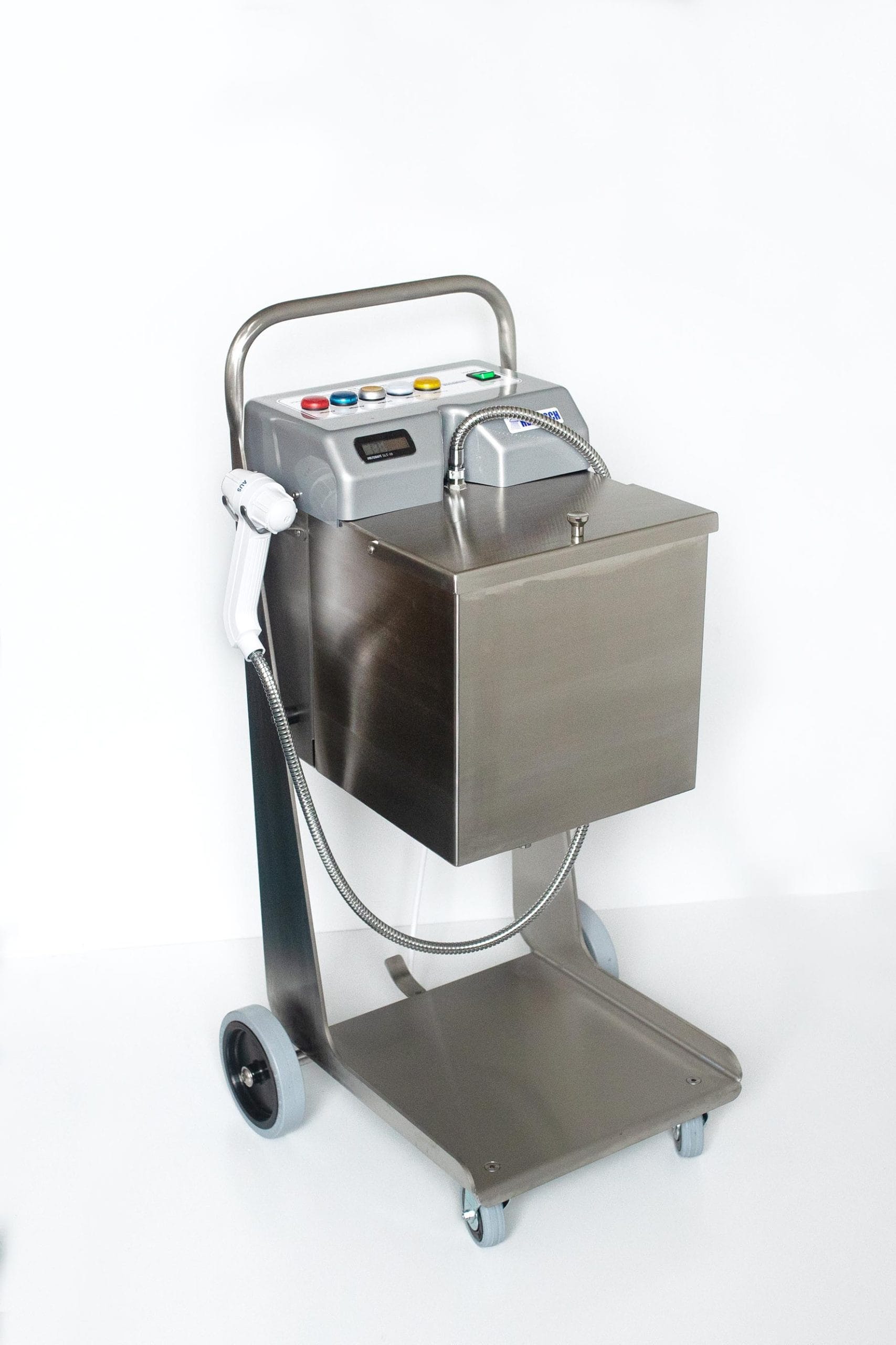 Další součástí je vozík na odpadní vodu na kolečkách, který umožňuje snadné vypuštění použité vody. Vozík na odpadní vodu je vyroben z plastu, aby byla jeho vlastní hmotnost co nejnižší. Díky rukojeti z nerezavějící oceli a praktickým kolečkům lze bez větší námahy přemístit i naplněný. To znamená, že špinavou vodu, která vzniká při sprchování, lze snadno a bezpečně odvést. Vozík na odpadní vodu o objemu asi 23 litrů pojme dostatek vody. Vejde se do ní více vody než na jedno naplnění nádržky na vodu ložní sprchy HEIWASCH. Vozík na odpadní vodu je důležitou a dobře promyšlenou součástí našeho ložního sprchového systému. Je součástí kompletního balení, ale lze jej koupit i samostatně.