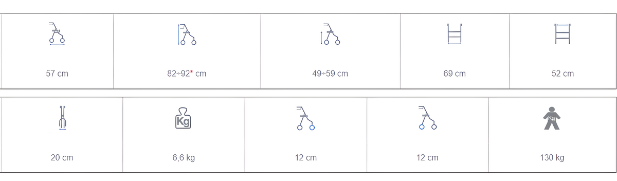 Chodítko je vyrobeno z eloxovaného hliníku. Má sklápěcí sedák a opěradlo z prodyšné tkaniny. Skládá se pomocí dvou páček, po složení má tloušťku jen 20 cm.