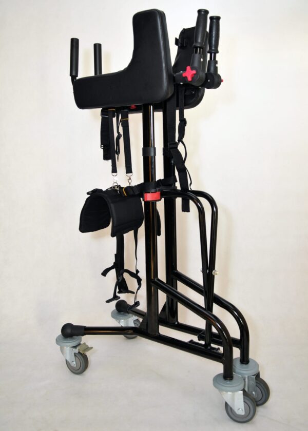 Všechna kola jsou vybavena plastovými nárazníky, které chrání stěny nebo nábytek před poškozením. Přední kolečka jsou aretační. Ke standardní výbavě chodítka patří ruční brzdy zadních koleček a bezpečnostní postroj se sedlem v ceně.