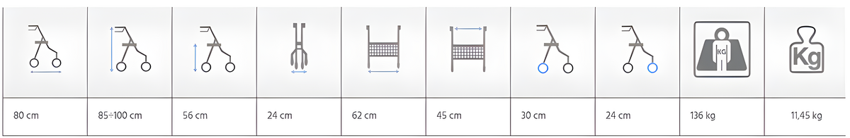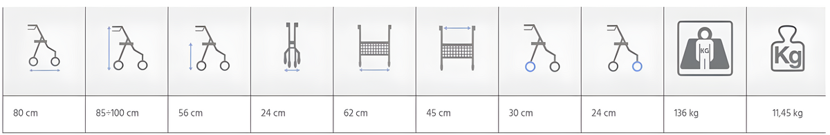 • Rolátor disponuje nastavitelnými rukojeťmi o výšce od 85 do 100 cm.