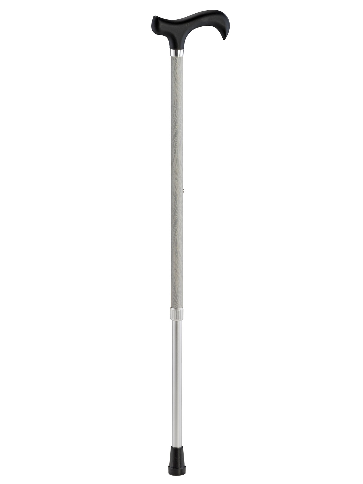 Hůl je vyrobena z hliníku. Rukojeť má tvar Derby s povrchovou úpravou soft-touch (příjemná na dotek). Trubice je stříbrná s reflexním povrchem pro lepší viditelnost. Výška je nastavitelná od 72 do 94,5 cm, takže ji jednoduše přizpůsobíte uživateli. Hůl je zakončena pryžovou koncovkou, která zajišťuje používání bez hluku. Hmotnost produktu 295 g. Maximální nosnost 100 kg.